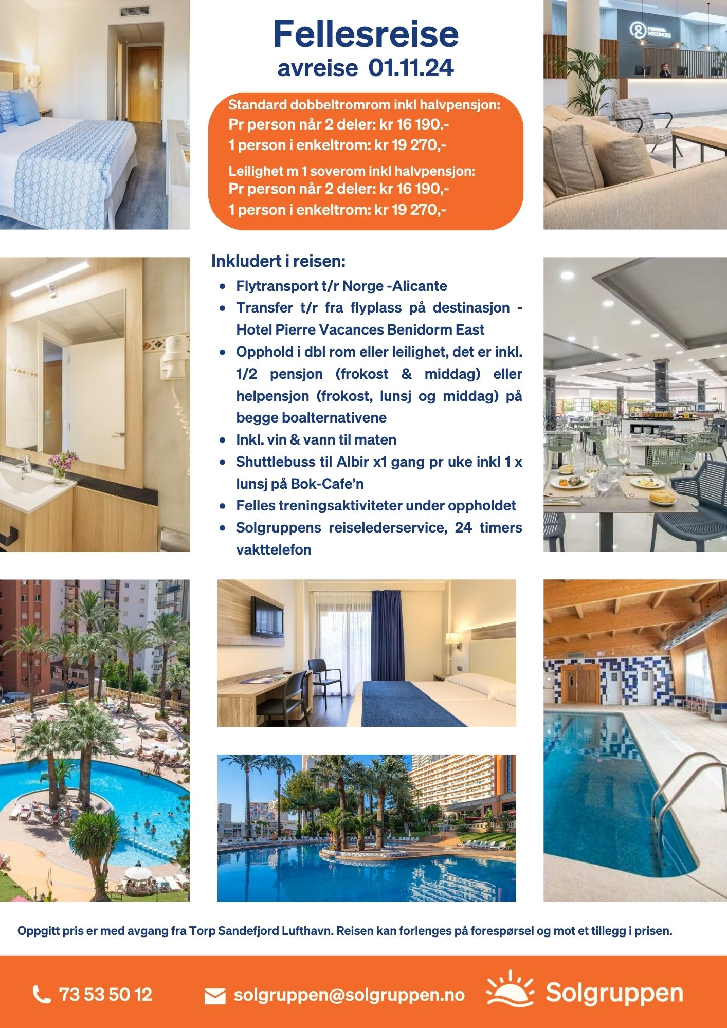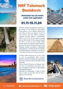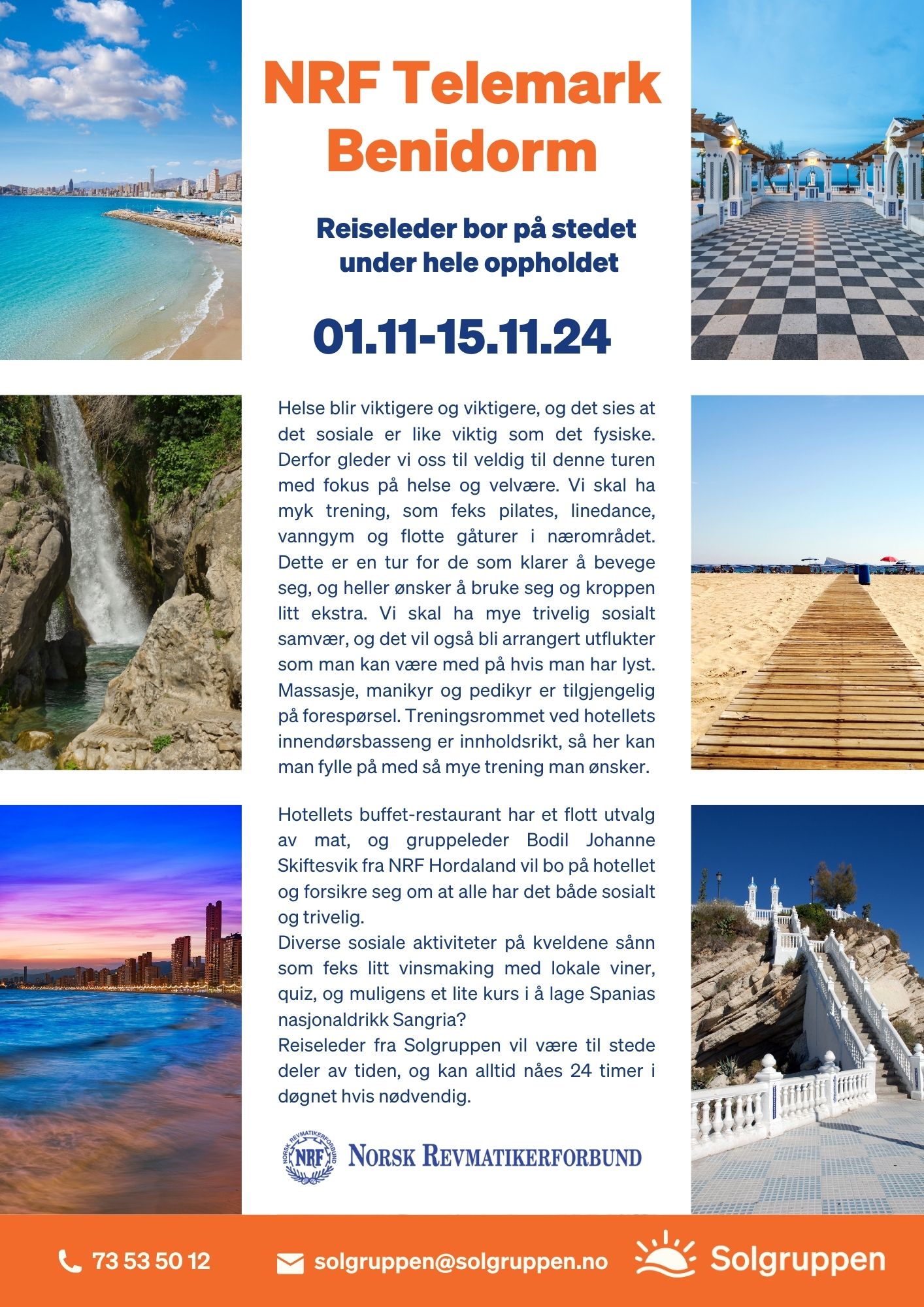 1.11.24-15.11.24 blir det fellesreise med Solgruppen til Benidorm. For mer informasjon kontakt Solgruppen på e-post: solgruppen@solgruppen.no eller på telefon: 73 53 50 12.