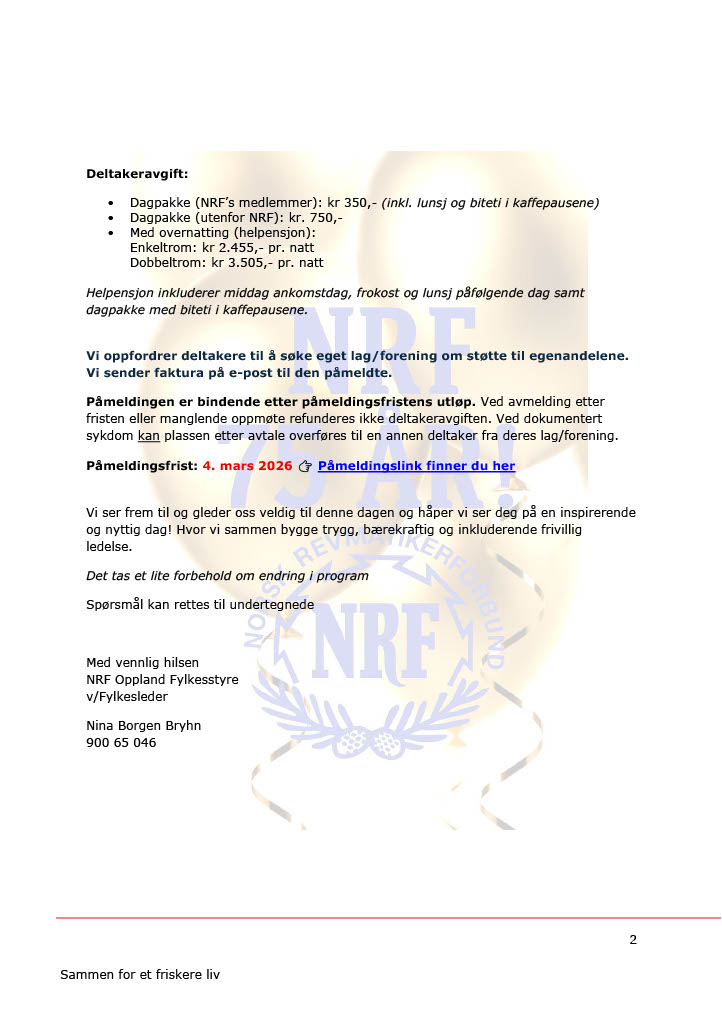 Vi har gleden av å invitere deg til NRF Opplands lederkonferanse. Dette blir en dag fylt med faglig påfyll, inspirasjon og erfaringsdeling – skreddersydd for deg som allerede har, eller vurderer å ta på deg, et lederverv som frivillig.