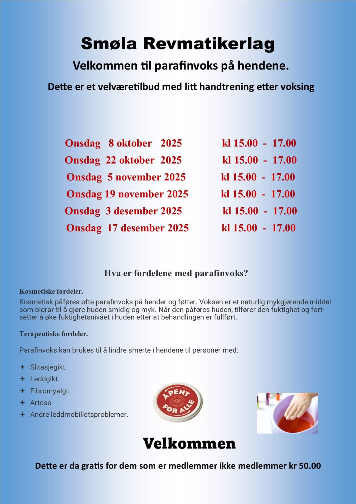 Skrevet av: Smøla revmatikerlag / Publisert: 08.10.2025 / Oppdatert: 07.10.2025 Postet i: Smøla Revmatikerlag / Aktivitet: Åpent og for alle Del: