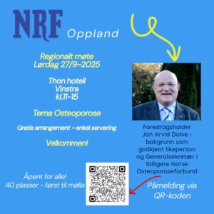 - 27.09.25: Tema Osteoporose– foredrag v/ Jan Arvid Dolve fra NRF`s diagnosegruppe for Osteoporose.