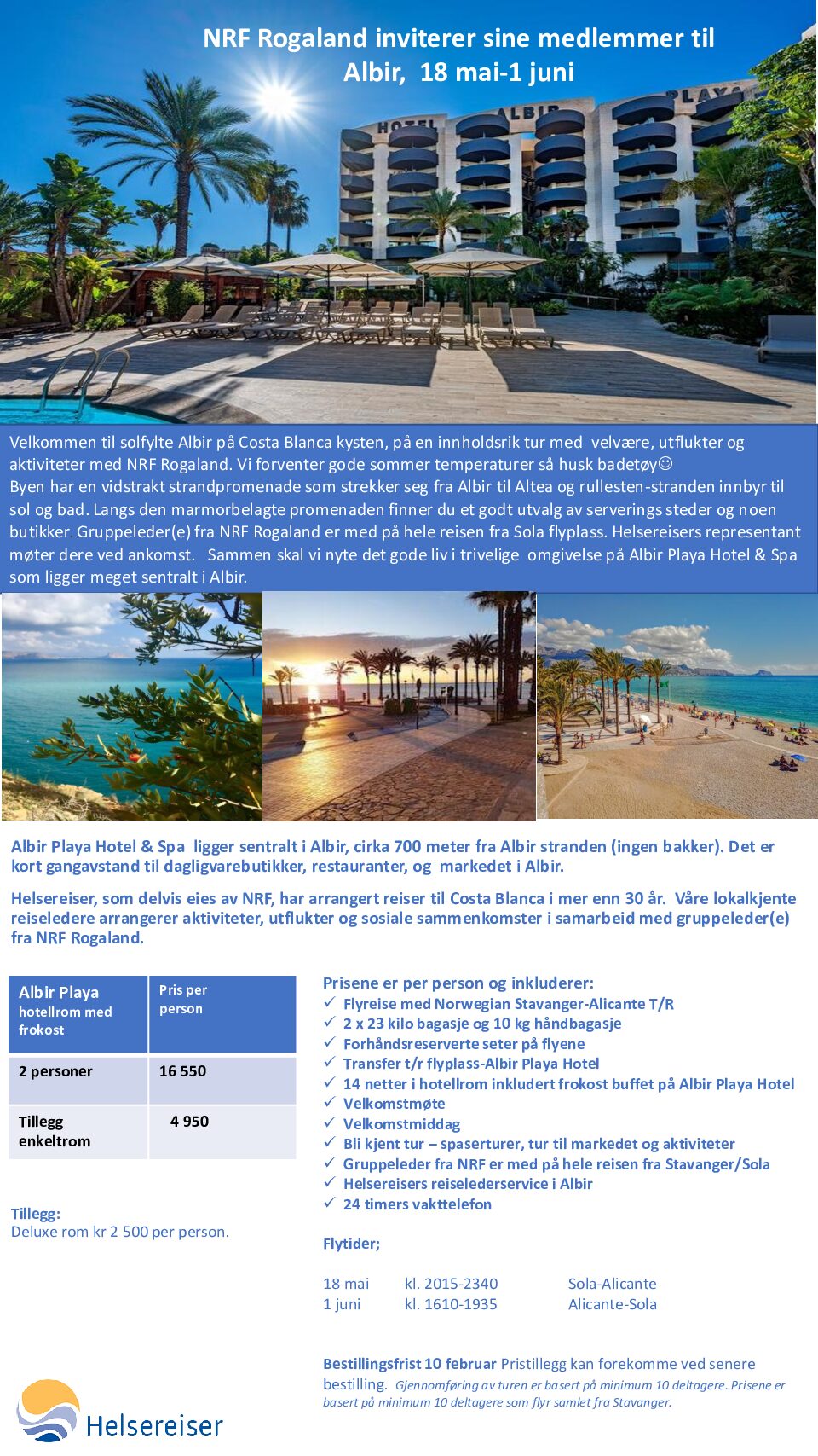 Bli med oss til solfylte Albir på en innholdsrik tur med velvære, utflukter og aktiviteter i regi av NRF Rogaland 18.mai – 1 juni 2026.