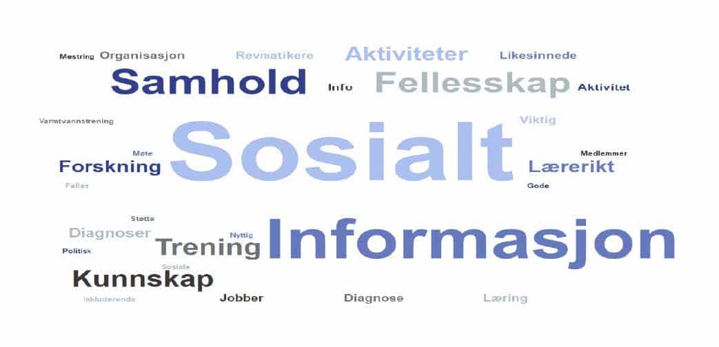 Her var det ordet «sosialt» som tronet skyen. Informasjon, samhold og fellesskap kom også høyt opp.